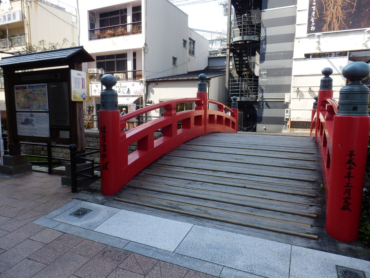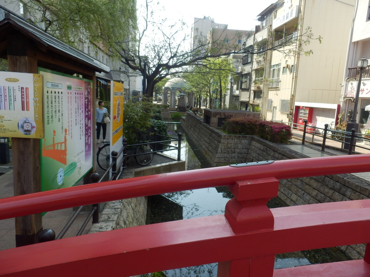 路面電車が交わり、高知市の中心であるはりまや橋ですが、私はてっきり名前しか残されていない地名(東京ではよくあるケース)だと思っていたのですが、橋はきちんとありました。大通り沿いの歩道の脇にオブジェのような感じで真っ赤な橋が掛けられ、下には小川も流れてました。