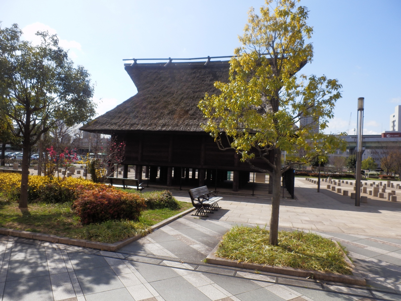 難波は飛鳥時代に中国大陸から我国に文化をもたらし又大陸へ向かう人達の交通の要所となっていた、発掘調査により五世紀後半の建物群(16棟以上)が発掘され当時の姿を推察できる場所が大阪城の南、大阪歴史博物館前にありごくわずかですが忠実に再現されています、、参考資料*現地設置の説明用立札