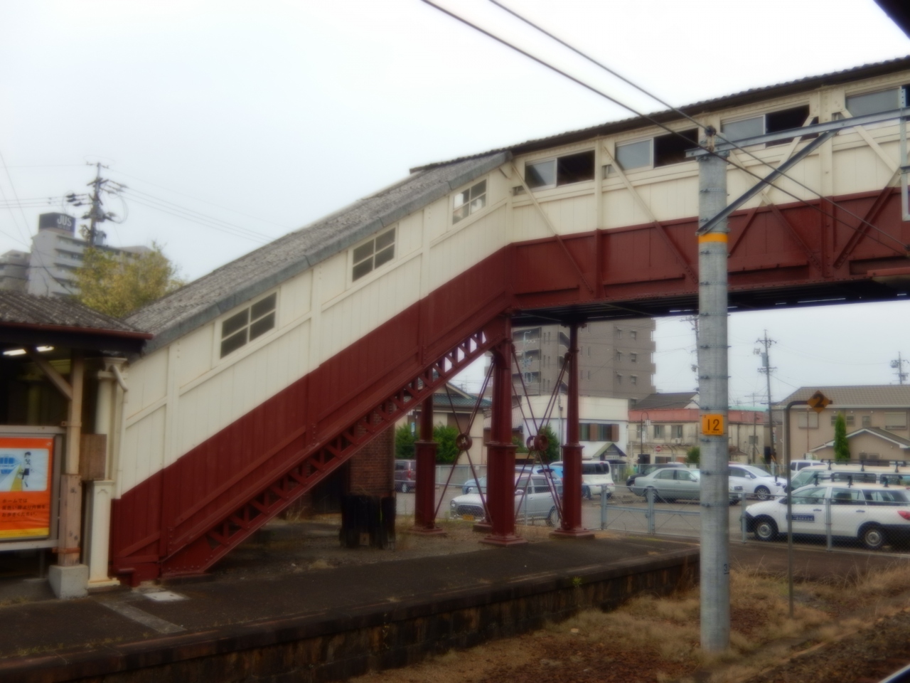 JR武豊線半田駅構内にあります、大府と武豊を結ぶJR武豊線の中間駅である半田駅、明治19年(1886年)に開通した歴史ある鉄道路線、その半田駅に線路を渡る為の歩道橋つまり跨線橋、明治43年11月に設置され、明治時代から使用されています、現在使用されているJRの跨線橋では最も古いようです。