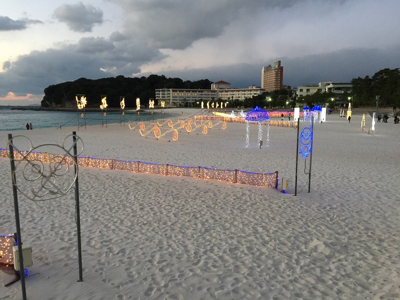 12月に南紀白浜を家族旅行したらちょうどイルミネーションをやっていました。夕暮れ時に家族で浜辺を散歩していたらはまべにいろいろな形の骨組みが並んでいて何かと思ったらLEDがキラキラし始めて子供たちは大喜びでしたよ。いい思い出です。