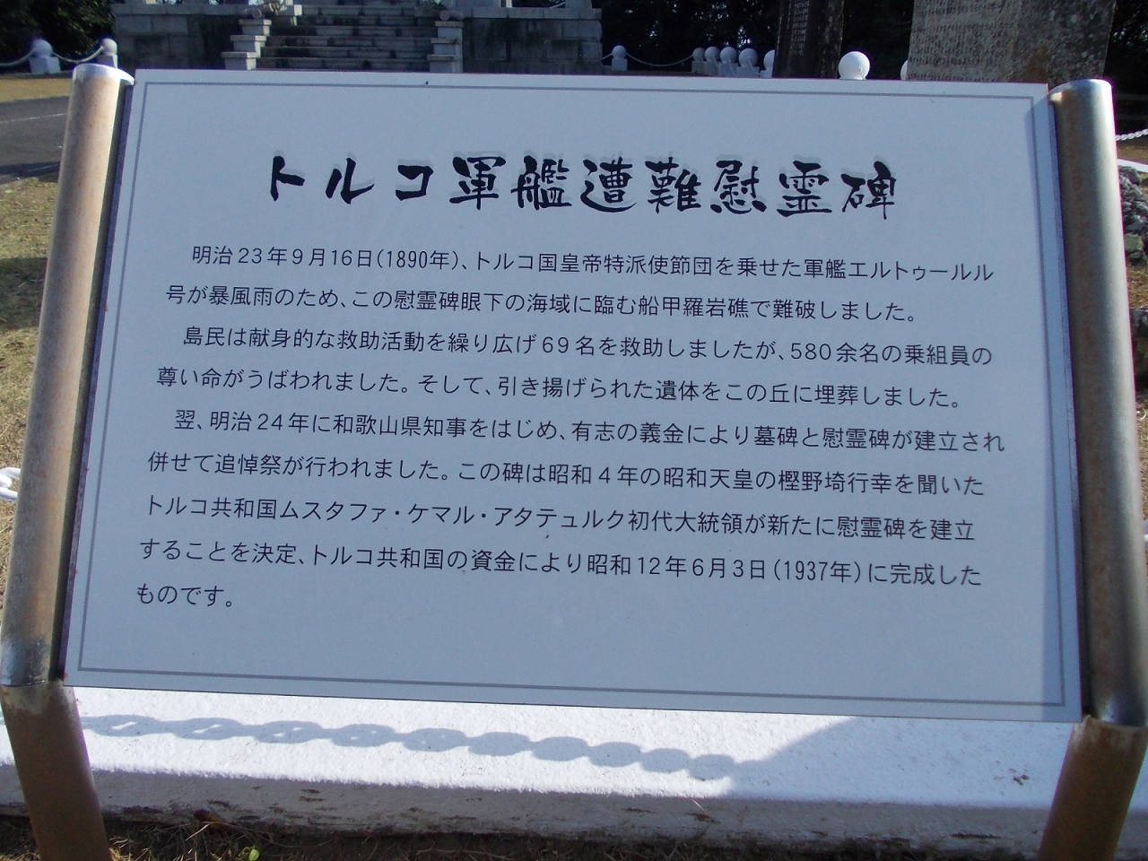 子供たちを連れて家族でドライブ旅行した時に潮岬と樫野崎灯台を見に行きました。樫野崎灯台の前にトルコの大統領のかっこいい騎馬像があってその前に大きな慰霊碑がたっていたんで何かと思ってみた見たら昔トルコの軍艦がここで遭難したことで作られたということがわかったんで子供たちと一緒に手を合わせてきました。