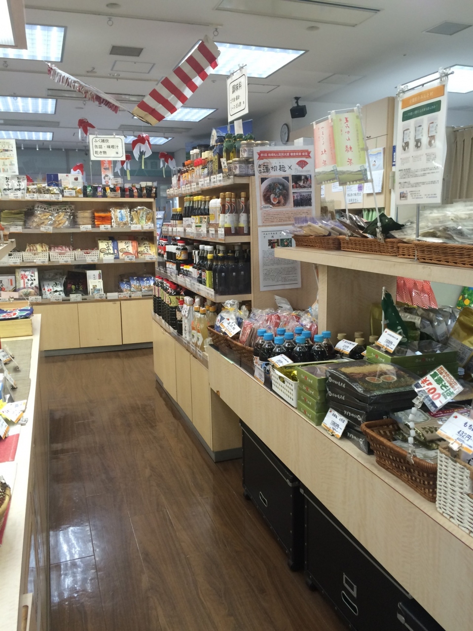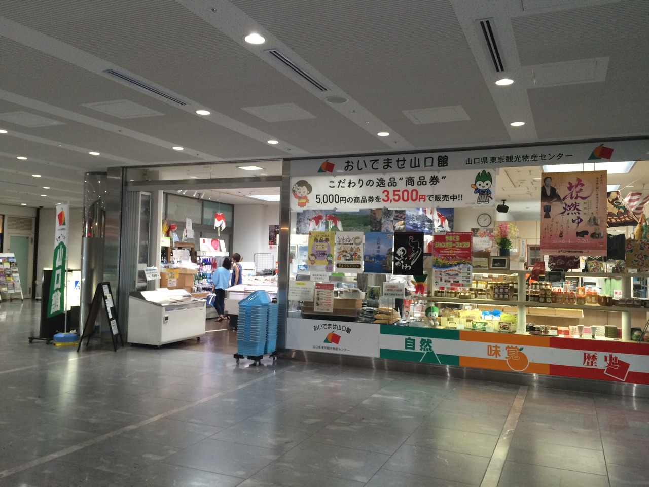入口を入ると山口県産の物産が販売されていて生ものも売っています。奥には観光コーナーもあり山口県の主な観光施設のパンフレットも置いてあり山口新聞も置いてありました。また山口県に関する書籍も販売しています。