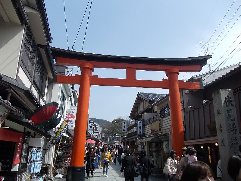伏見稲荷神社の参道に並んでいるお土産屋さんとか食べ物屋さんの商店街ですね。3月だったんですけども着物姿の観光客だらけでもうすれ違うのも大変でした。ソフトクリームとかソースとかくっついちゃったらどうするんだろと他人なのに気が気じゃなかったですよ。外国人の観光客も多かったです。