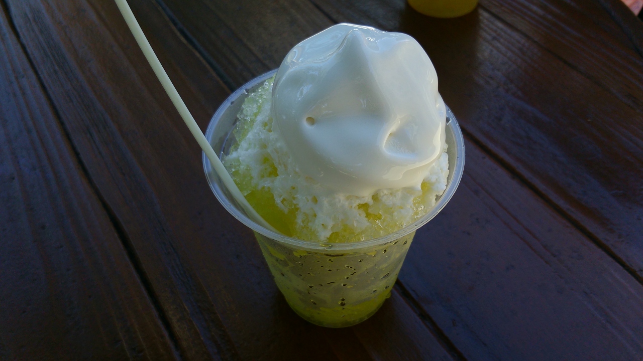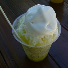 シェーブアイス、いわゆるかき氷です☆メロン味食べました。ソフトクリームが付いているものと、付いていないものがあります。ソフトクリームの後にかき氷を食べると、甘さの関係で、かき氷が薄く感じますが、普通においしく食べられます。オススメ☆