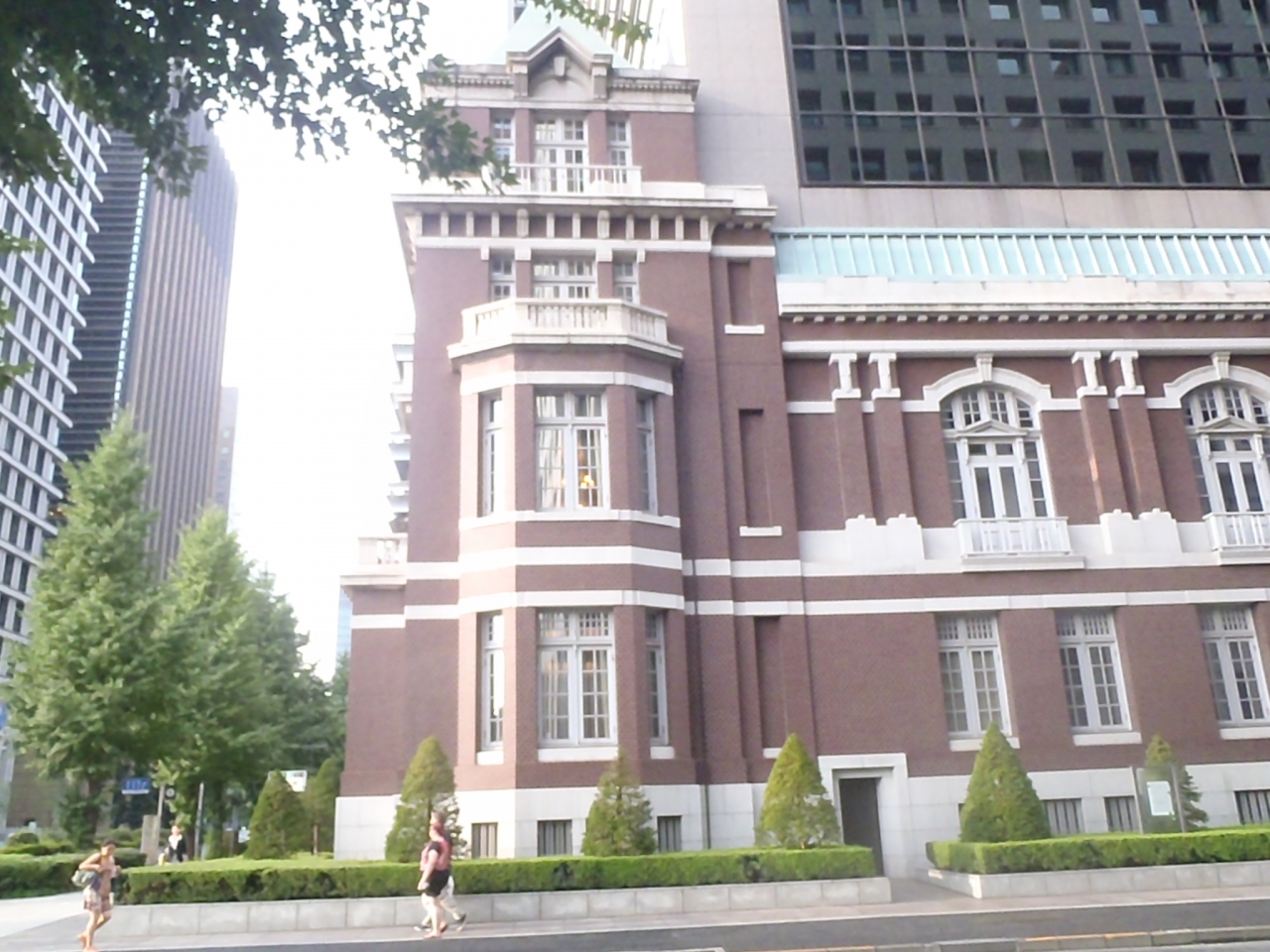 JR東京駅丸の内北口を出て西方面へまっすぐ、新丸の内ビルデングの北側の道路を日比谷通りとの角に立つレンガ造りで窓に白い縁とバルコニーがあるビルです。