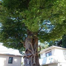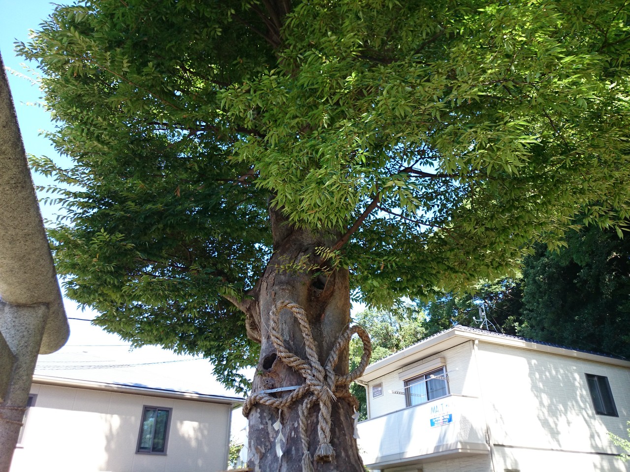 石段の下の鳥居の横には、横浜市指定の古木のけやきの木がご神木として立っています。