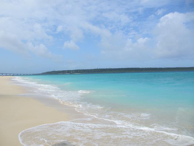 宮古島東急ホテル&リゾーツ前の白い砂浜が続くビーチ、白い砂浜と宮古ブルーの海のコントラストが素敵です。目の前には来間大橋や来間島が眺められます。