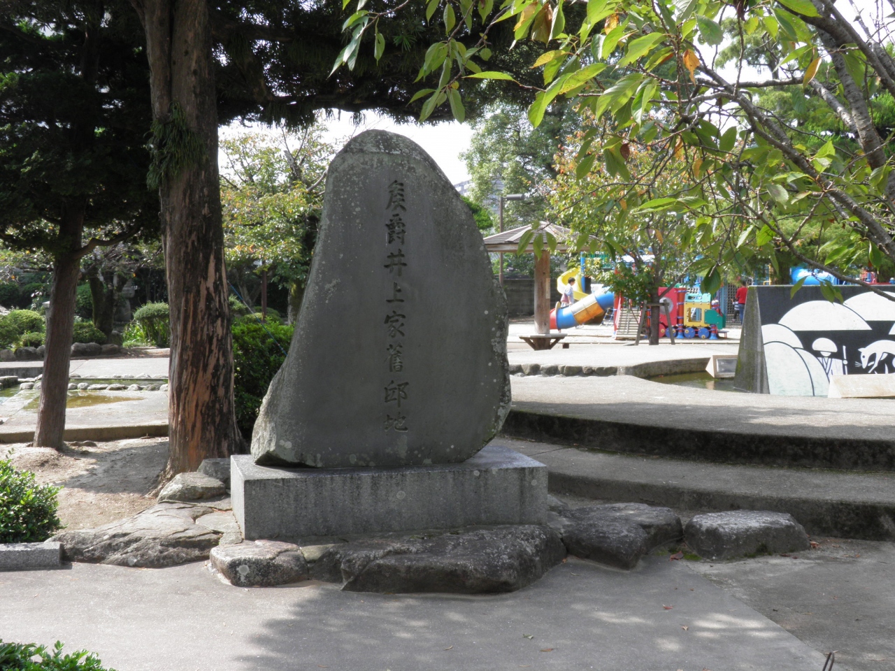 1864年5月、七卿は山口に落ちのび、三条実美は井上馨の邸宅に滞在した。井上家は実美のための離れを増築し、「何遠亭」と名付けた。「龍尾の手水鉢」は井上邸に古くからあった手水鉢で、三条実美も使用したと考えられている。