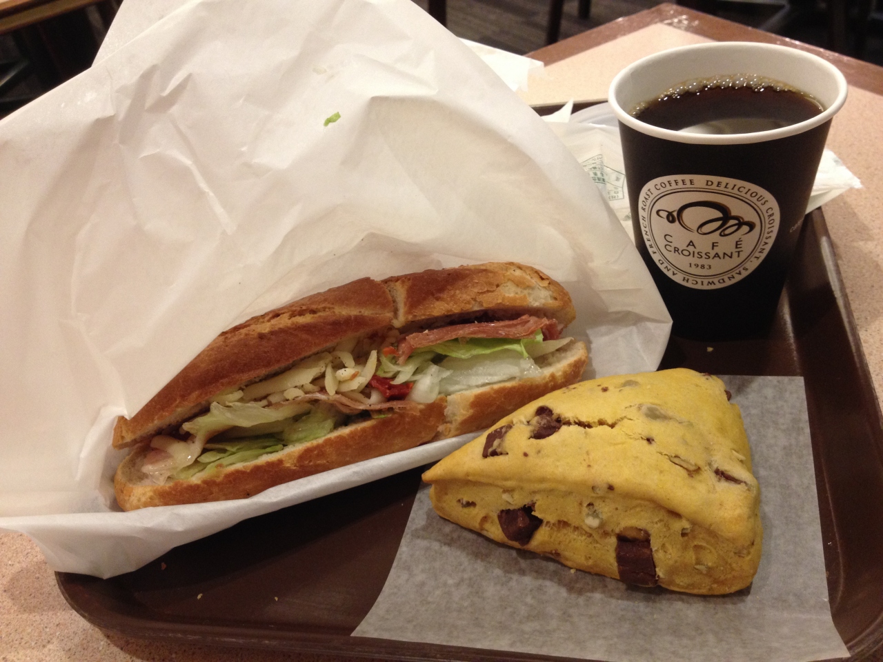 チェックインを済ませた後、時間があったのでランチに立ち寄りました。バケットプロシュート(490円)、パンプキンスコーン(270円)をいただきました。機内食は美味しくないので、ここぞとばかりの腹ごしらえ。スコーンはイマイチでしたが、バケットは美味しかったです。