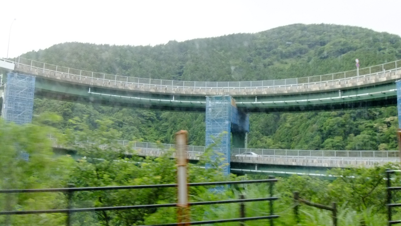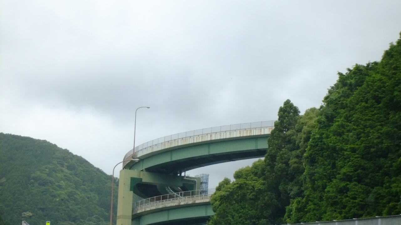 家族で伊豆に観光をしに行きました。熱川方面から修善寺に行く際にこのループ橋を使用しました。何度か通行してはいますが、やはり、突然出現!って感じがなかなかいいです。初夏だったので山々の緑が映えていて風景もきれいです。
