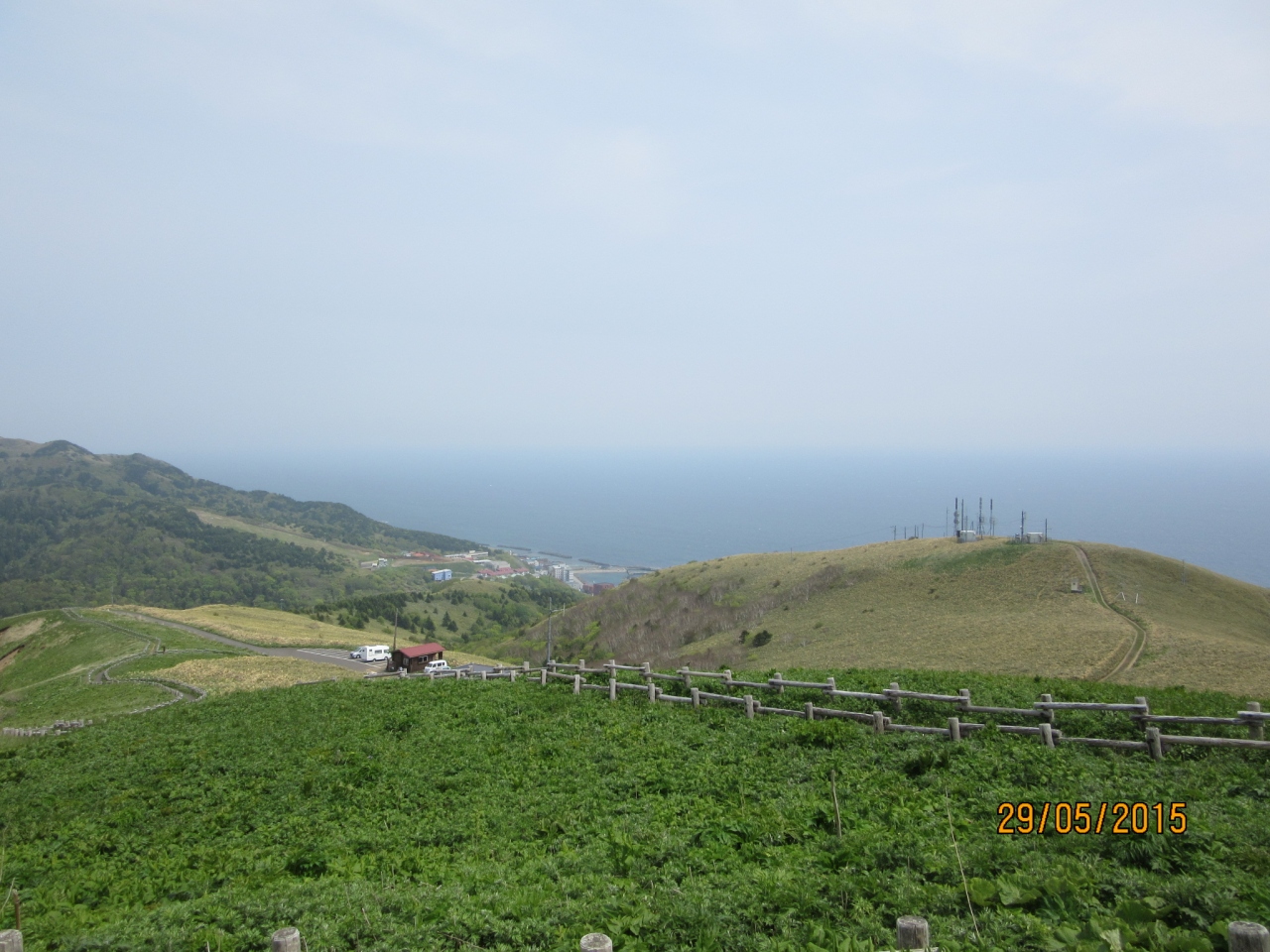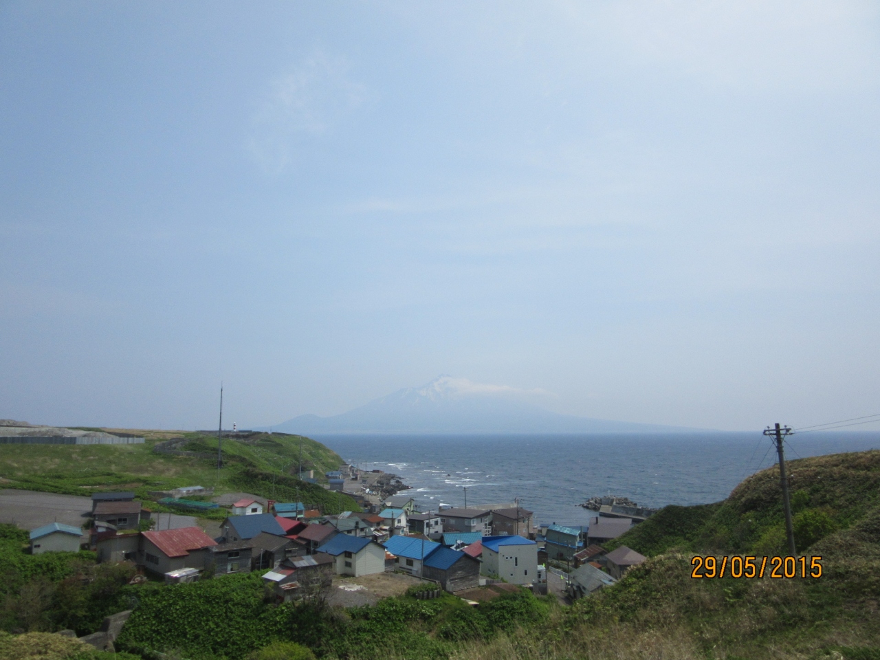 元地灯台⇒知床 2キロ 約30分 青い海と利尻富士が迫ってくる絶景で下り坂。