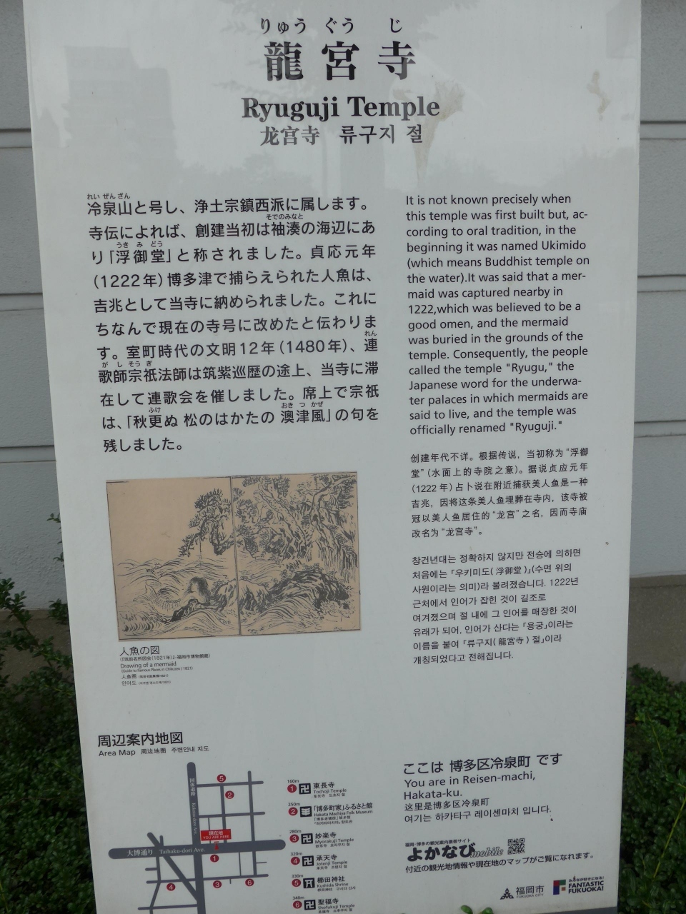 現在の名前には1222年博多津で捕えられた人魚を吉兆として当寺に収められたことから「龍宮寺」と号寺に改められたと説明されていました。