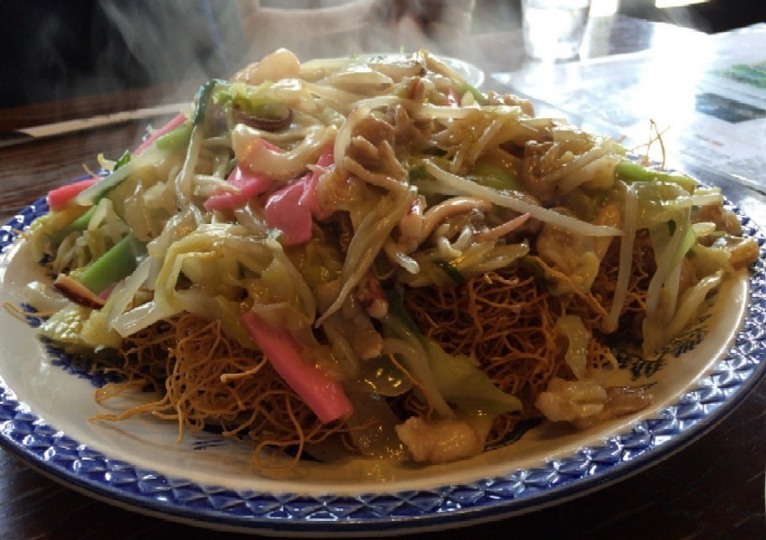 長崎皿うどんは一皿ずつではなく2人前大皿の一緒に盛り付けて登場するのがこちらの店の特徴で迫力満点!