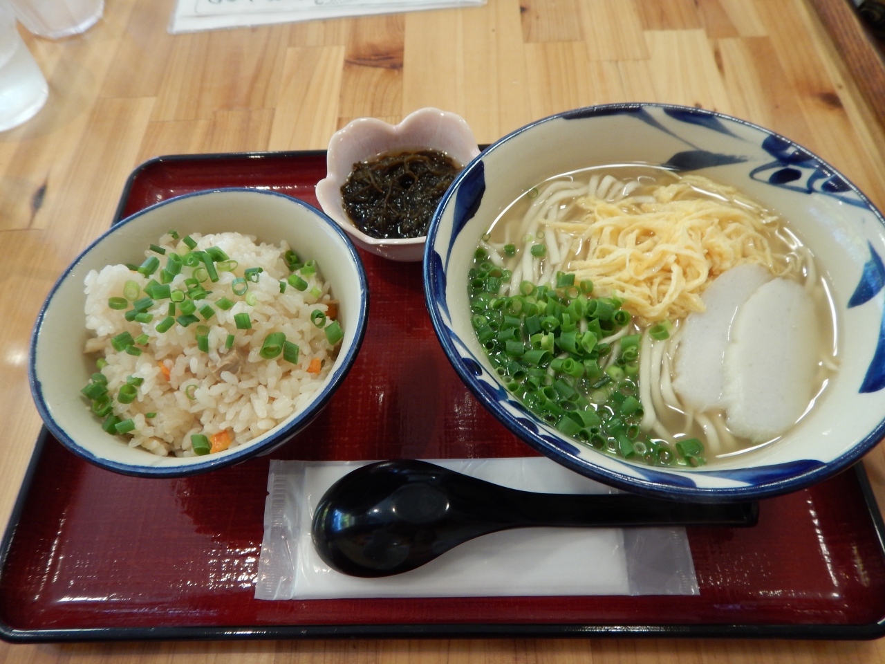 ゆいレールの牧志駅から県庁の方に向かって少し歩いた所にあります。沖縄そばとじゅうしい(沖縄風の炊き込みごはん)のセットが500円という看板を見つけたので、入ってみました。沖縄そばはやや少なめですが、錦糸玉子とかまぼこがのっていて美味しかったです。