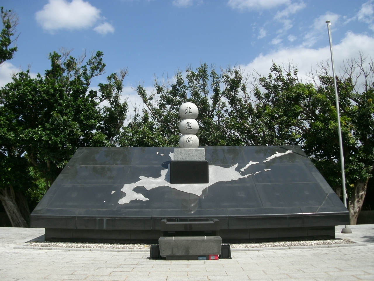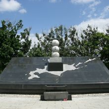 太平洋戦争中、沖縄、南方諸地域で戦没した北海道出身者40,850柱がお祀りされています。建立は1954年で都道府県別の慰霊碑としては最初に建立されたもので、その後、1972年に北海道の全市町村の石を持ち寄って新しく立て直されたそうで、北海道の地図がデザインされています。