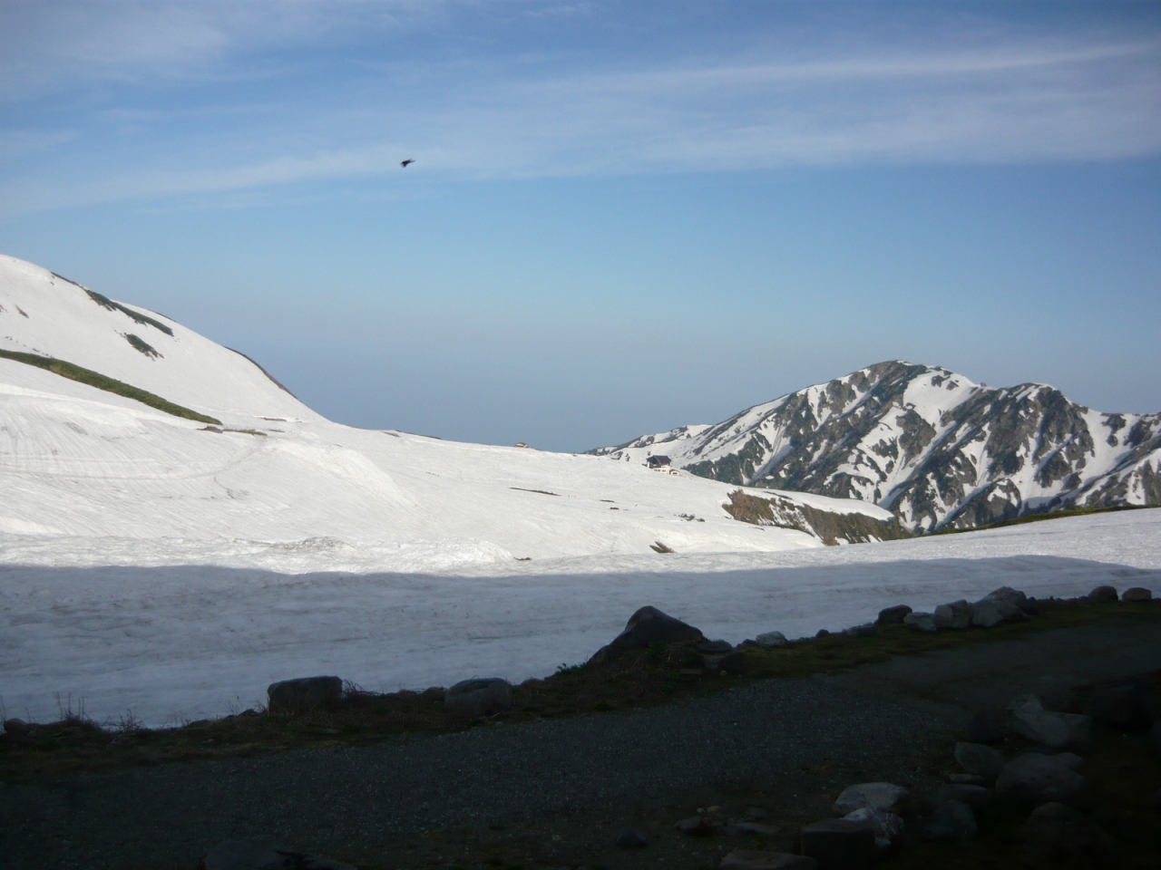 周辺には雪がまだかなりあったので、5月の末ごろに行かれる方は、足元がしっかりした防水の靴を用意する必要があります。また、晴れて無風の状態で室堂の気温は10℃でした。一般的に100m上がるごとに気温が0.6℃下がっていきます。標高2500メートルの室堂では無風の状態でも平地より15℃下がりますので、服装は事前に十分考慮する必要があります。