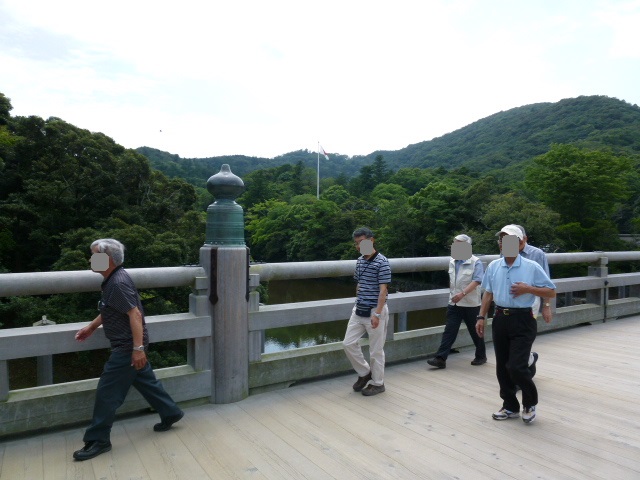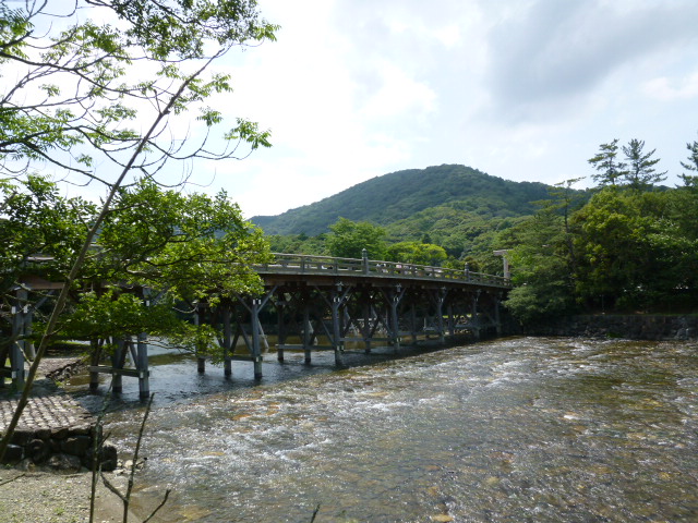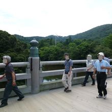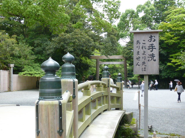 今日は伊勢神宮の散策です。まずは外宮の豊受大神宮を参拝し、ここ内宮の皇大神宮の参拝です。ちょっと離れていますね、バスで10分程度でしょうか、かかりました。広さは外宮より内宮の方が広いように思います。外宮と異なったところが発見できますよ。さぁー宇治橋を渡って中に入ってみましょう。