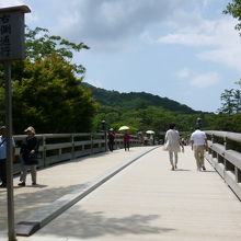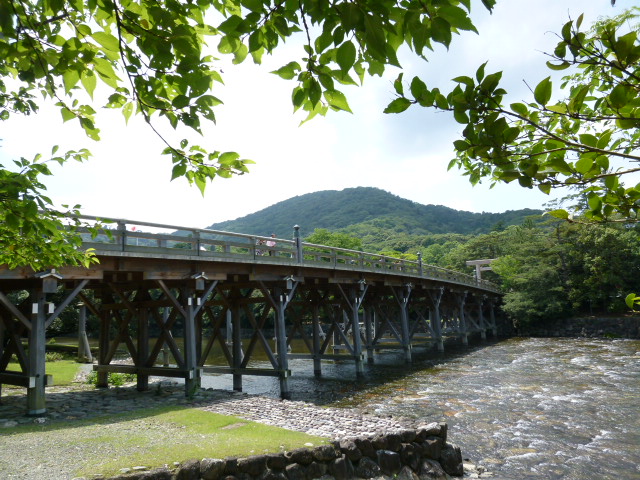 今日は伊勢神宮の散策です。まずは外宮の豊受大神宮を参拝し、バス移動でここ内宮の皇大神宮の参拝です。中に入るとまずカッコイイ宇治橋があります。あれー「宇治橋}? 確か京都の宇治橋と同じ? と思われる方は少なくないでしょう。規模は小さいですが流れている「五十鈴川」は清らかで、雰囲気バツグンです。さぁー渡って右に進んで行きましょう。正宮まではちょっと距離がありますよ。がんばりましょう。