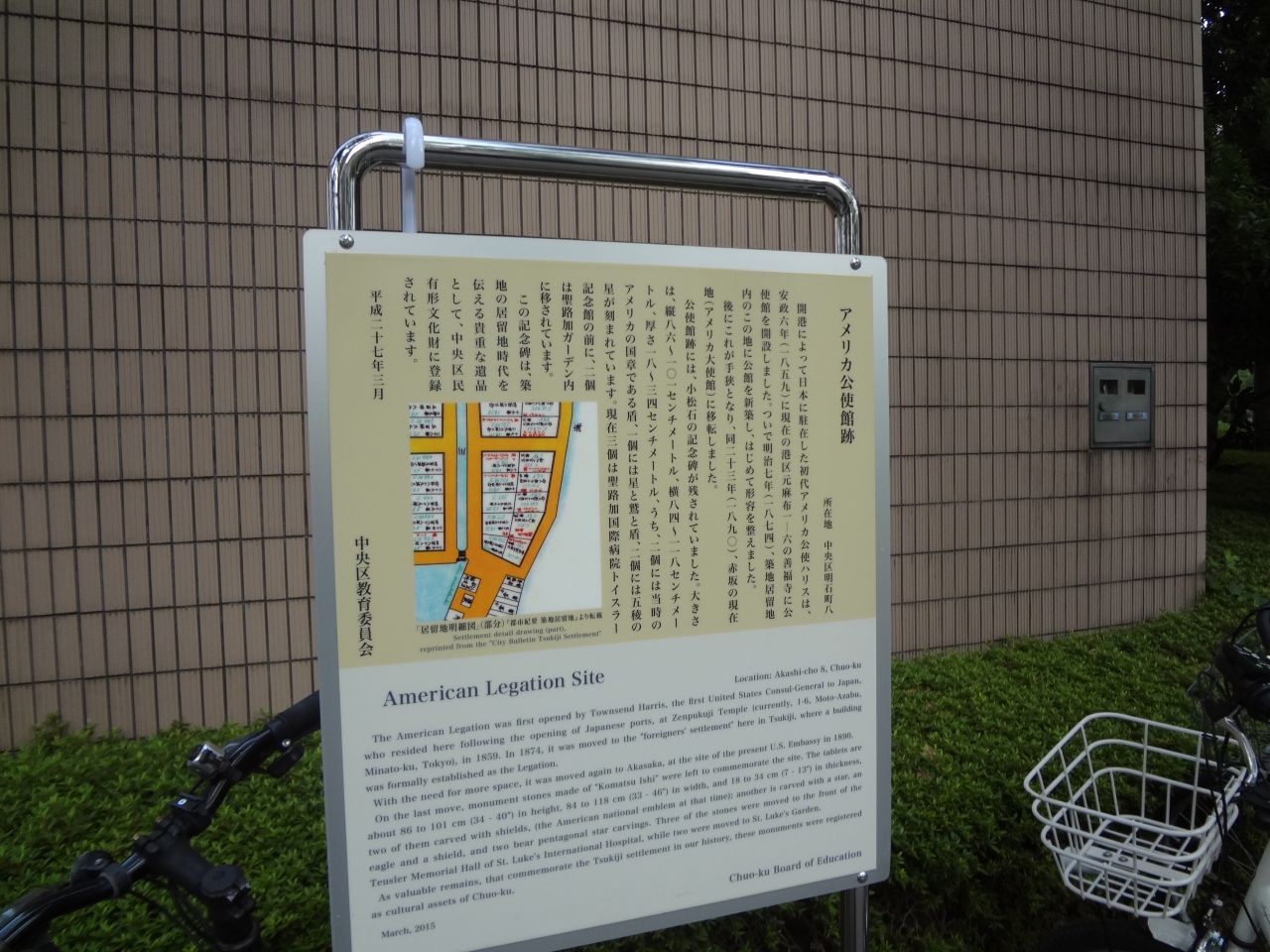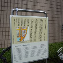 隅田川沿いに建つ高層ツインビル「聖路加タワー」のすぐ近くに案内板の姿を見つけ、近づいてみると「アメリカ公使館跡」を示すものであることがわかりました。