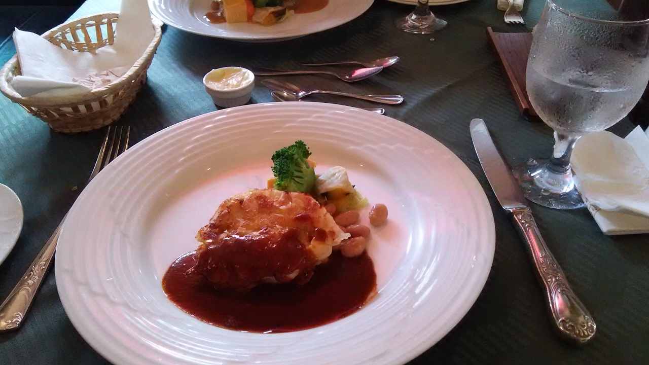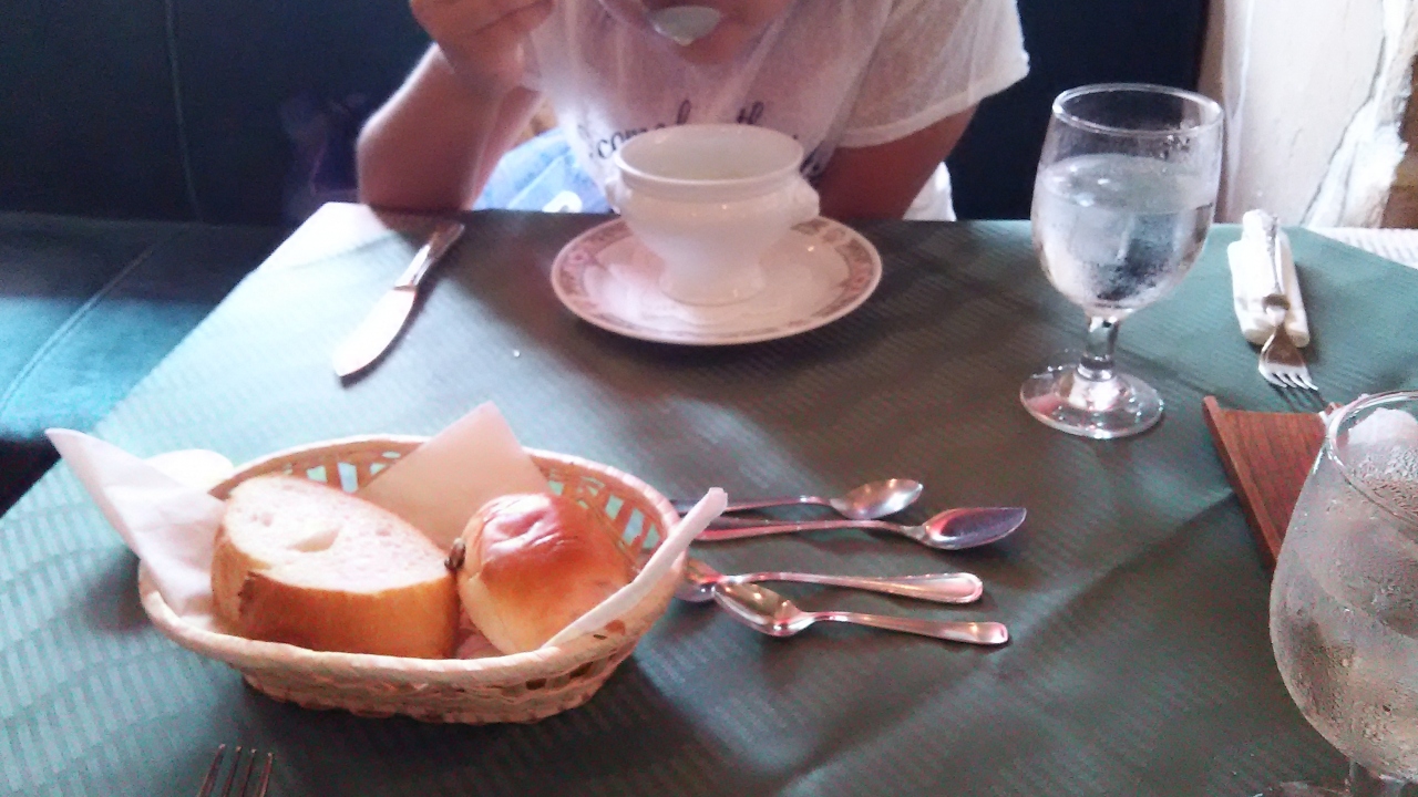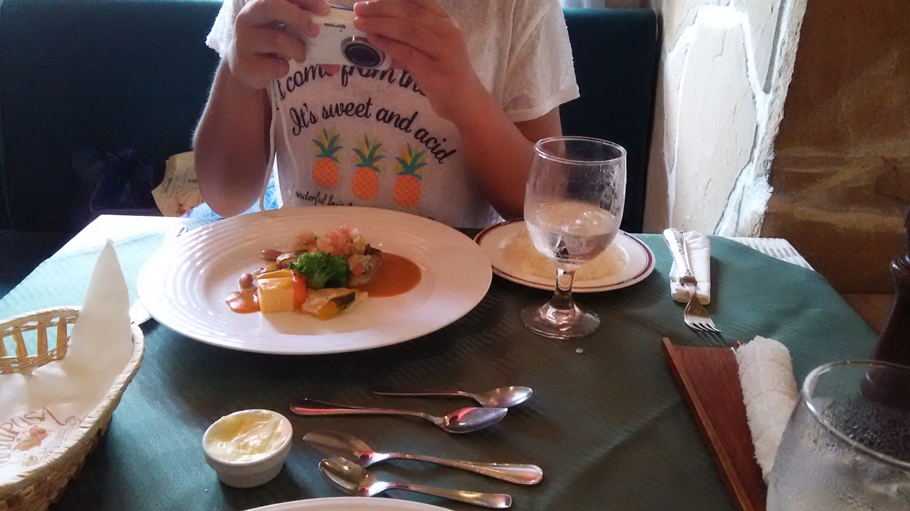 パンダ娘はフランス料理、ナイフ・フォークは初めて。私は肉とパン、パンダ娘は魚とライスを注文。