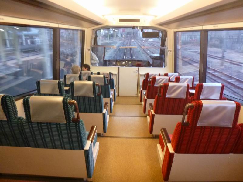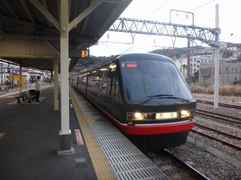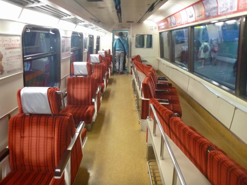 伊東からの帰りに熱海まで乗車しました。伊豆急行の展望車両リゾート21を黒塗りにリニューアルしたもので、JR伊東線にも乗り入れ、熱海~伊豆急下田間で運行しています。海側と山側で座席配置が異なり、海側の座席は海がよく見えるよう外側を向いているのが特長。先頭および最後部の車両は階段状になっている展望車です。