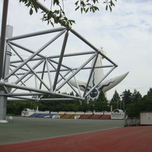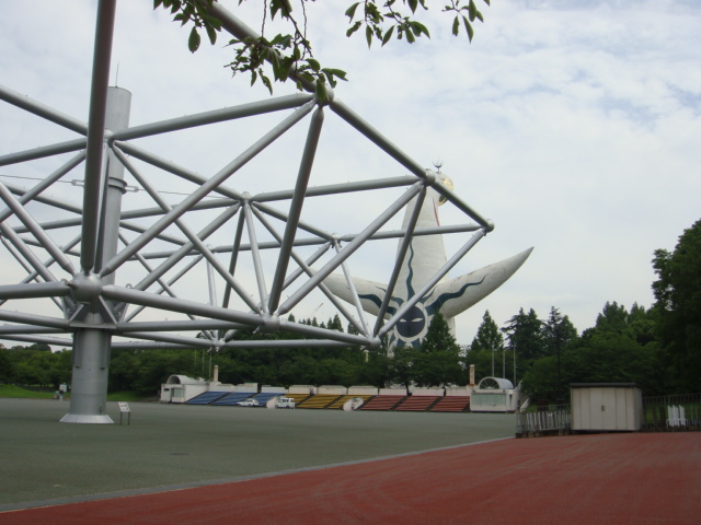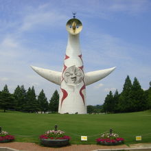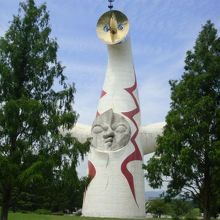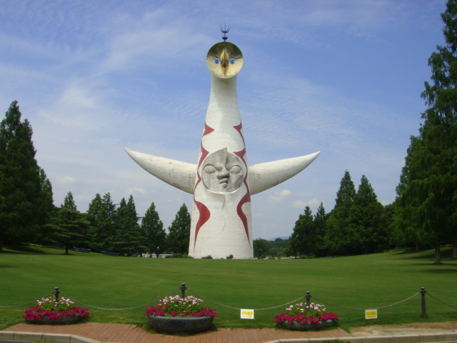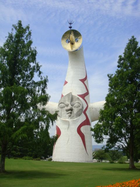 ご存じ大阪万博のテーマ館のシンボルとして、岡本太郎が制作した代表作の1つです。万博当時の太陽の塔は、「お祭り広場」中央に、広場を覆う銀色のトラスで構築された大屋根から塔の上半分がつき出す形で建てられていましたが、現在は芝生の広場にポツンと置かれた存在で、何処となくさみしそうです。なお背面にも顔があり、これは過去を表しているようです。