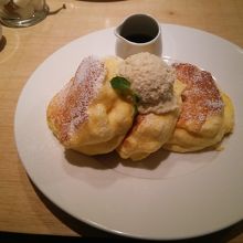 こちらのパンケーキはふわふわでしゅわ~っとしたスフレタイプのパンケーキです。