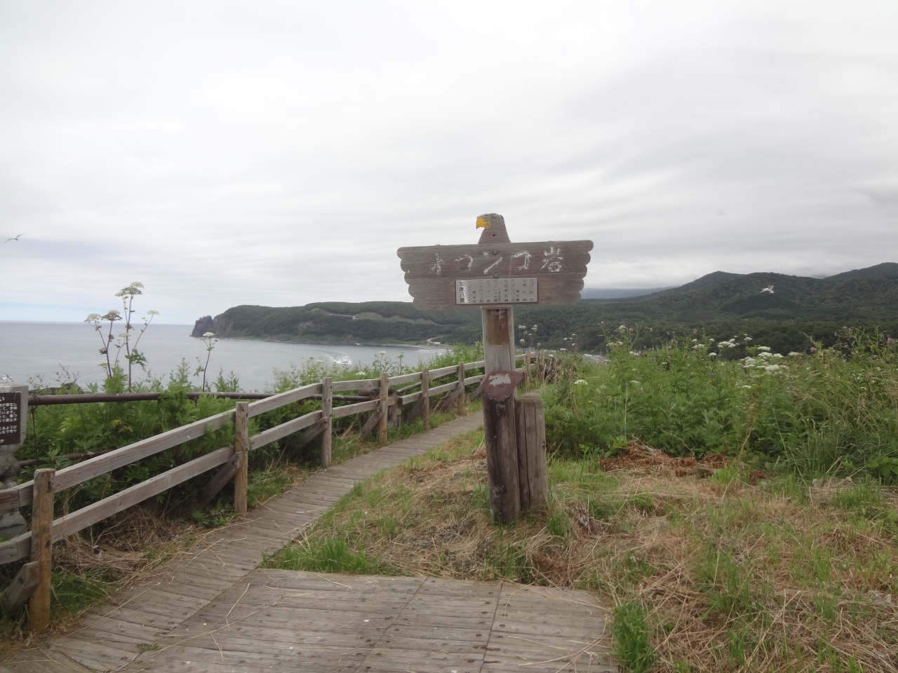 オーストラリアのエアーズロックと比較するとスケールが違いすぎますが、それでもけっこうな高さです。頂上まで登るには駐車場脇から備え付けの遊歩道を登っていかなければなりません。途中まではかなりの急勾配です。下が良く見えるので高所恐怖症の方にはちょっと怖いかもしれません。それでも途中から緩やかになり、頂上につくとそこからはウトロ港が一望。まさに絶景が見渡せます。この日は曇り空でしたが、それでも「うわーすごーい」思わず行ってしまうほど。また付近をたくさんの鳥が飛んでいて、目線がちょうど同じくらいと、これまたなかなか貴重な体験でした。頂上はぐるっと一周できる遊歩道が備わっています。