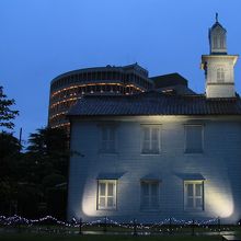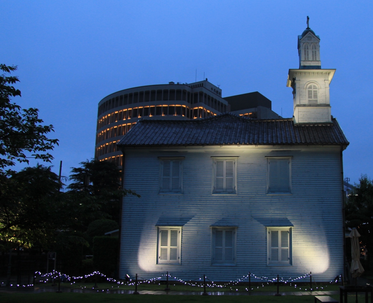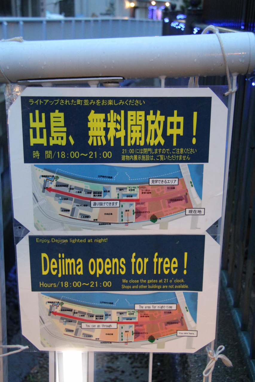 長崎県美術館に向かう途中出島のライトアップされた建物が目にとまったので立ち寄りました。夜間でしたが入口が開放されていて、良く見れば無料開放の張り紙がありました。建物の中には入れませんが、ライトアップされた建物を見ながら通り抜けが出来ます。雨が降っていたからか他に観光客はおらず貸切状態でした。