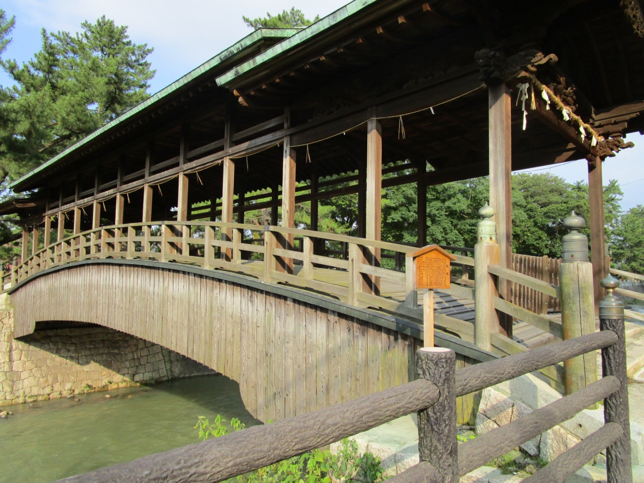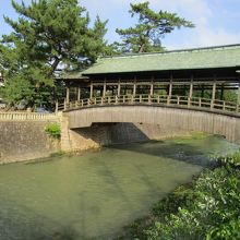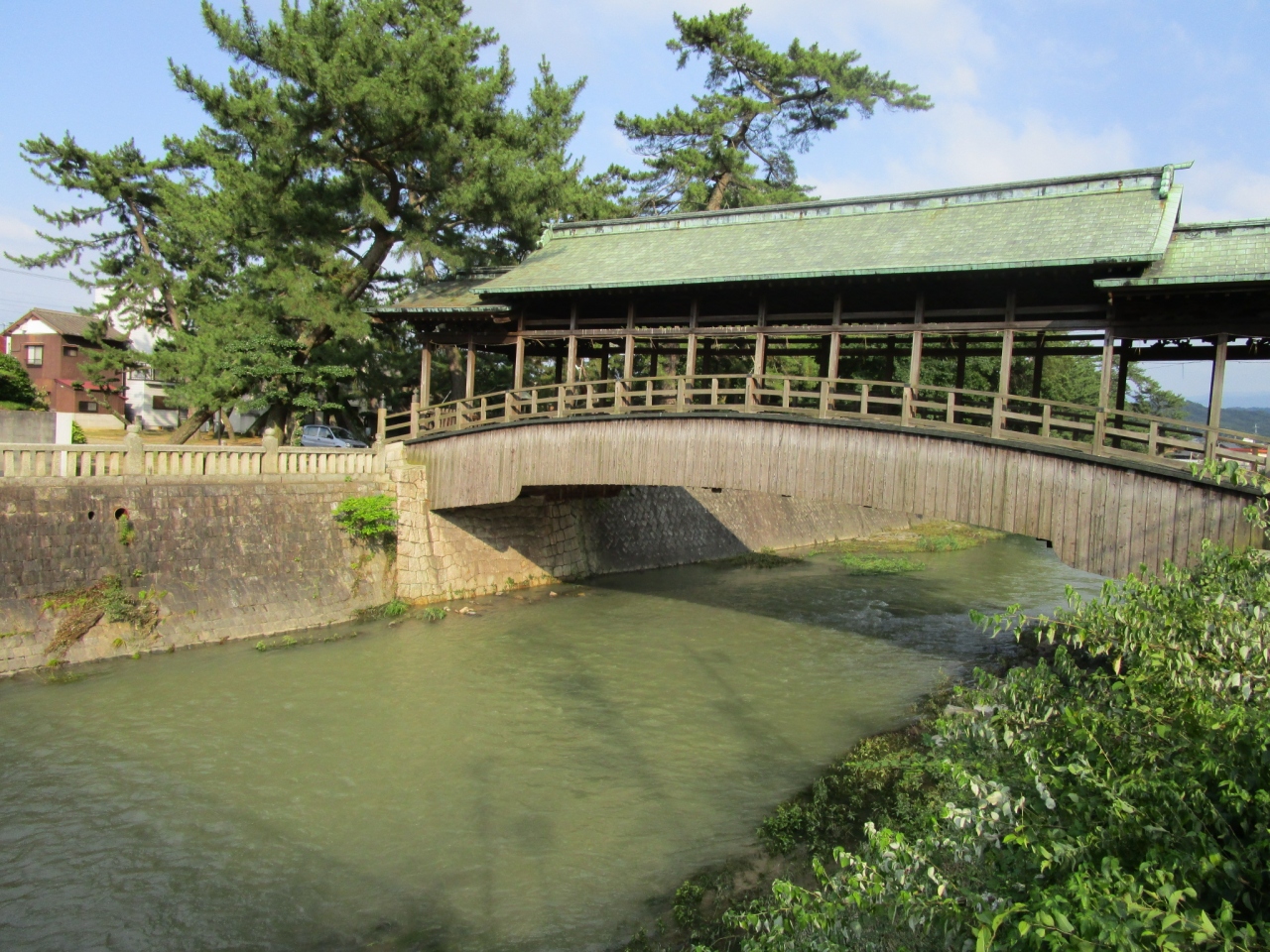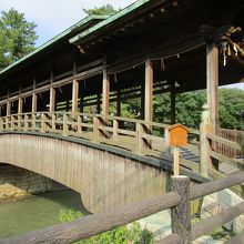 アーチ状の木の橋に屋根が付いているちょっと見かけない形の橋です。