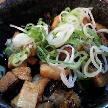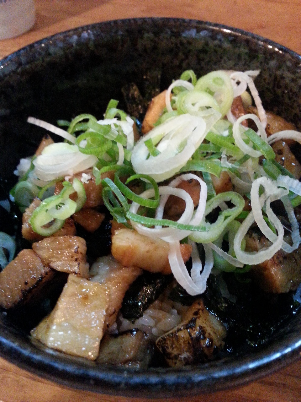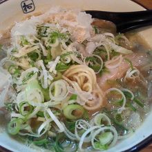 某グルメサイトのクチコミ数が230件超えだったので行ってみた。注文したのは豚×魚のダブルラーメン、削り節が盛られた風変わりなビジュアル。スープは魚介系濃厚豚骨を、煮干、昆布、鰹の和風だしで割ったとのこと、濃厚かげんに少し重さを感じたが、全体的には奥深い風味があり美味しく頂けた。バーナーの炎であぶったチャーシュー丼も香ばしく満足なランチであった。ランチ時はご飯メニューが100園引きになる。