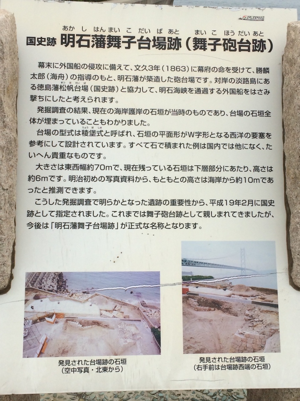 昔マクドナルドだったマンションの横に、チョコんとしてある遺跡です。砲台もレプリカが設置してあったりして、みるだけでなく触ったり出来るのもいいです。(本当の遺跡のレプリカは触れないようにしてあります。)舞子駅からも歩いてすぐいけるのでぜひ行かれて欲しい場所です。