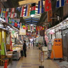 恵美須駅から徒歩数分、通天閣に向かう通りの右側にあるアーケード商店街です。訪れた日は雨でしたが、アーケード商店街には水たまりが?見上げると天井のシートに穴が開いておりそこから雨水が落ちてきていました。ほぼ半分はシャッターが閉まっており、開いているお店も昭和時代を思わせれる商品が置いてあり活気はありません。天井には運動会で使うような万国国旗が飾られ、50年前にタイムスリップした感がありました。