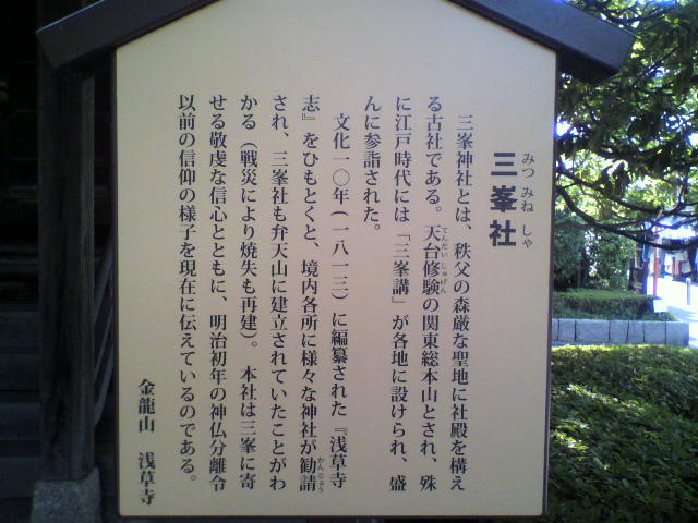浅草寺の境内にあるこちらの三峰(三峯)神社は、秩父の三峯神社の末社だそうです。かつては境内にさまざまな神社が勧請されていて、こちらの神社も、弁天山に建立されていたそうで、戦災により消失するも、再建されたとのことです。