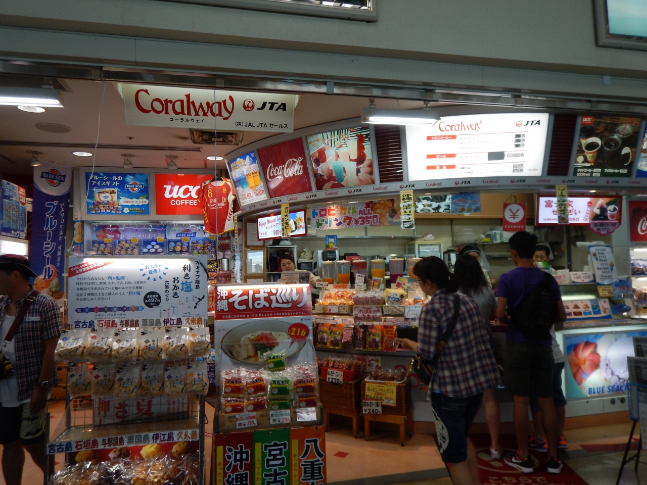 JALのゲートラウンジにあり、27番ゲートの通路をはさんで向かいです。軽食は沖縄そばぐらいですが、ブルーシールのアイスクリームや、有名な富士屋のぜんざいも売っていました。沖縄風のおにぎりやお弁当が多く、土産物もすこしありました。