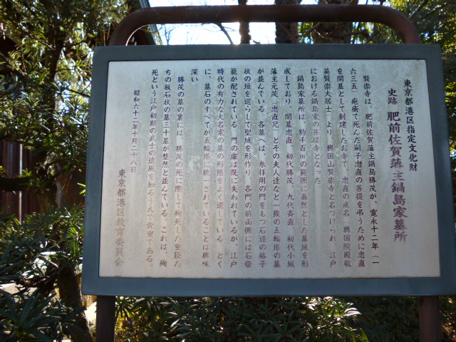 麻布の裏通りにある大黒坂からさらに奥まった場所に「賢崇寺」というお寺があり、その墓地に「肥前佐賀藩主鍋島家墓所」があります。大黒坂からかなり坂を登ることになるので、それなりの覚悟が必要です。