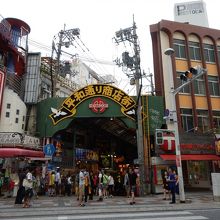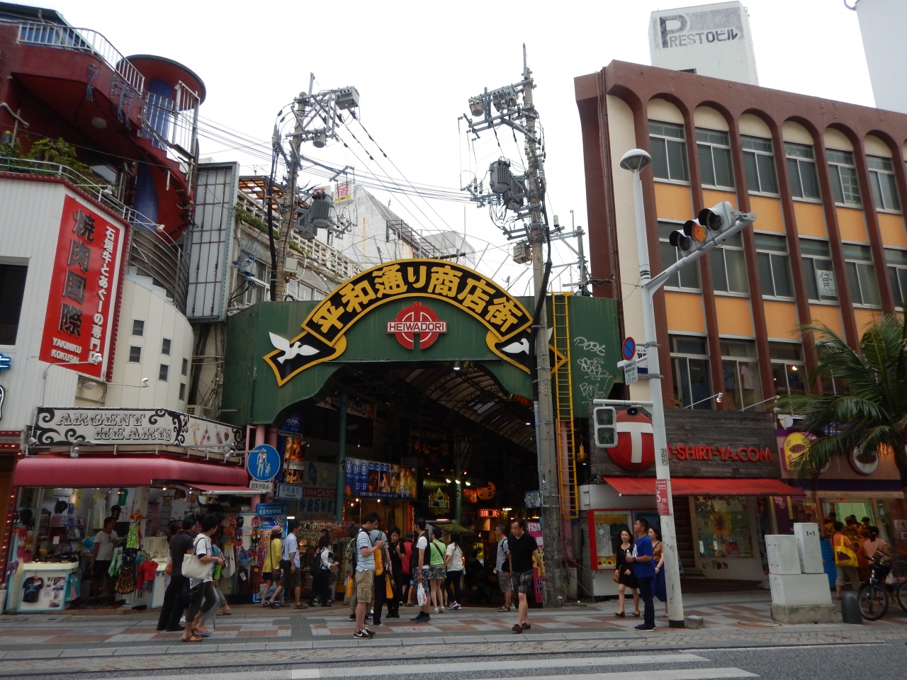 国際通りのほぼ真ん中あたりのハピナハ(三越デパートの後に出来た)の向かい側にある通りです。市場本通りと同様に、アーケードがついているので日焼けや雨にも安心です。しばらく歩いて行くと、有名な花笠食堂の看板も見えてきました。まさに東南アジアの雰囲気そのもので、土産物店もありますが、衣料品店が多いような気がしました。