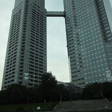 上層階に連絡ブリッジがあってユニークです。