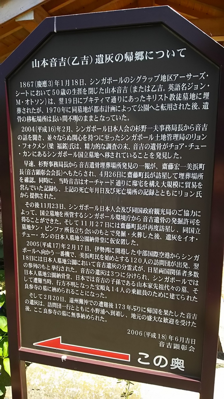 ここは日本初の和訳聖書の出版に協力した音吉、岩吉、久吉の墓があります。彼らは、1832年に志州島羽浦を出航した宝順丸が遭難して生き残った3人です。