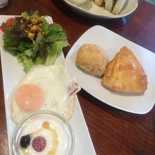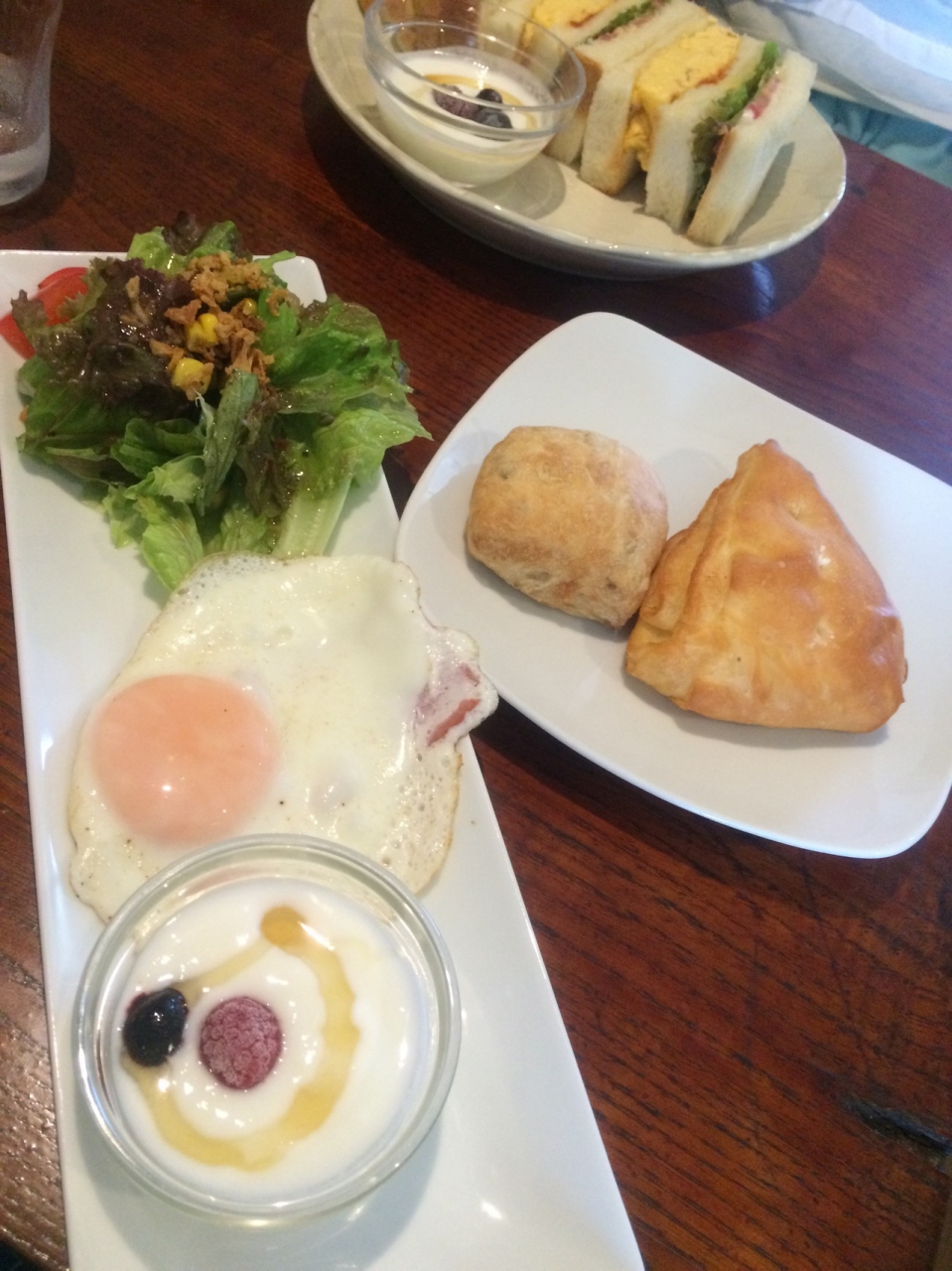 中崎町にあるカフェです。町家風を改装した感じの落ち着ける店内です。一階でオーダーしたら二階で待ちます。誰かのおうちに遊びに来ている気分です。ハムエッグとサラダ、ヨーグルトに2種のパンがセットになったモーニングにドリンクを足して650円ほどで食べられます。パンが おいしいです。
