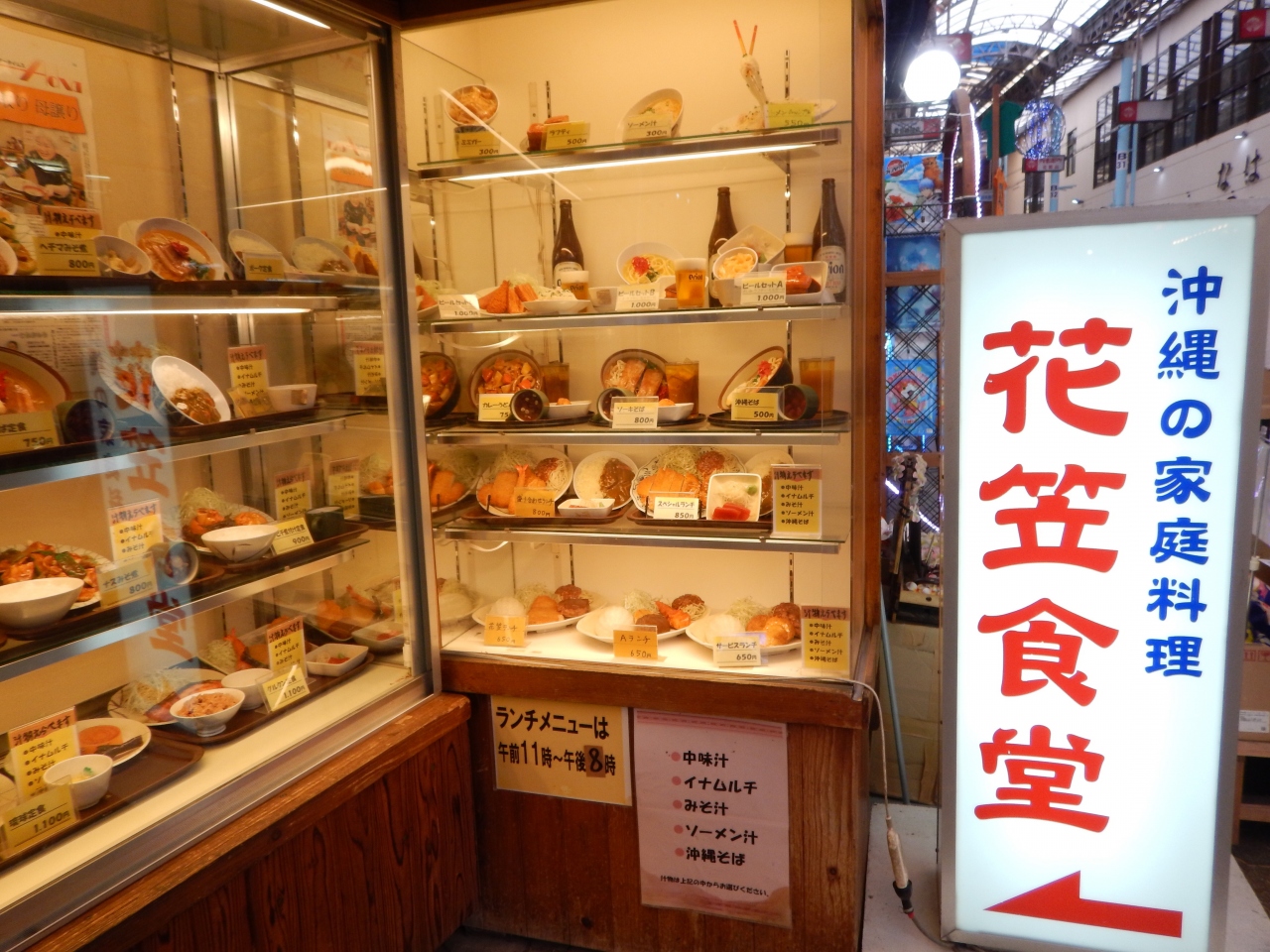 国際通りのほぼ中央、ハピナハの向かいの平和通りをしばらく歩いて行くと、左側に花笠食堂の看板が見えてきます。お店は看板の手前の細い道を左側に入ったところにあります。値段は他の沖縄の地元の食堂よりは少し高めですが、汁物が5種類、御飯物が3種類から選べるし、デザートのぜんざいも食べられるので、私は多少高くても楽しいからいいと思いました。