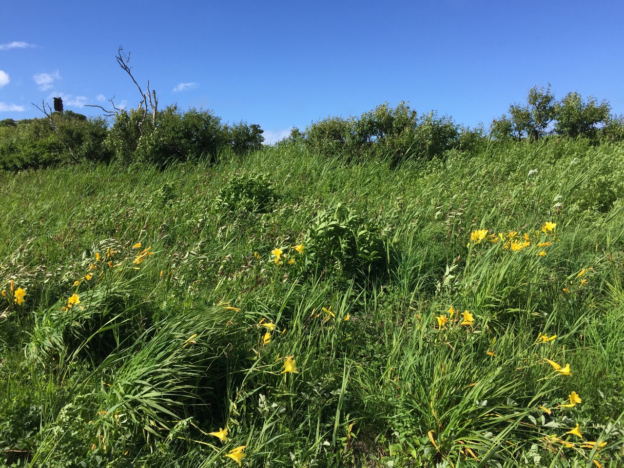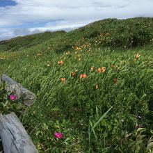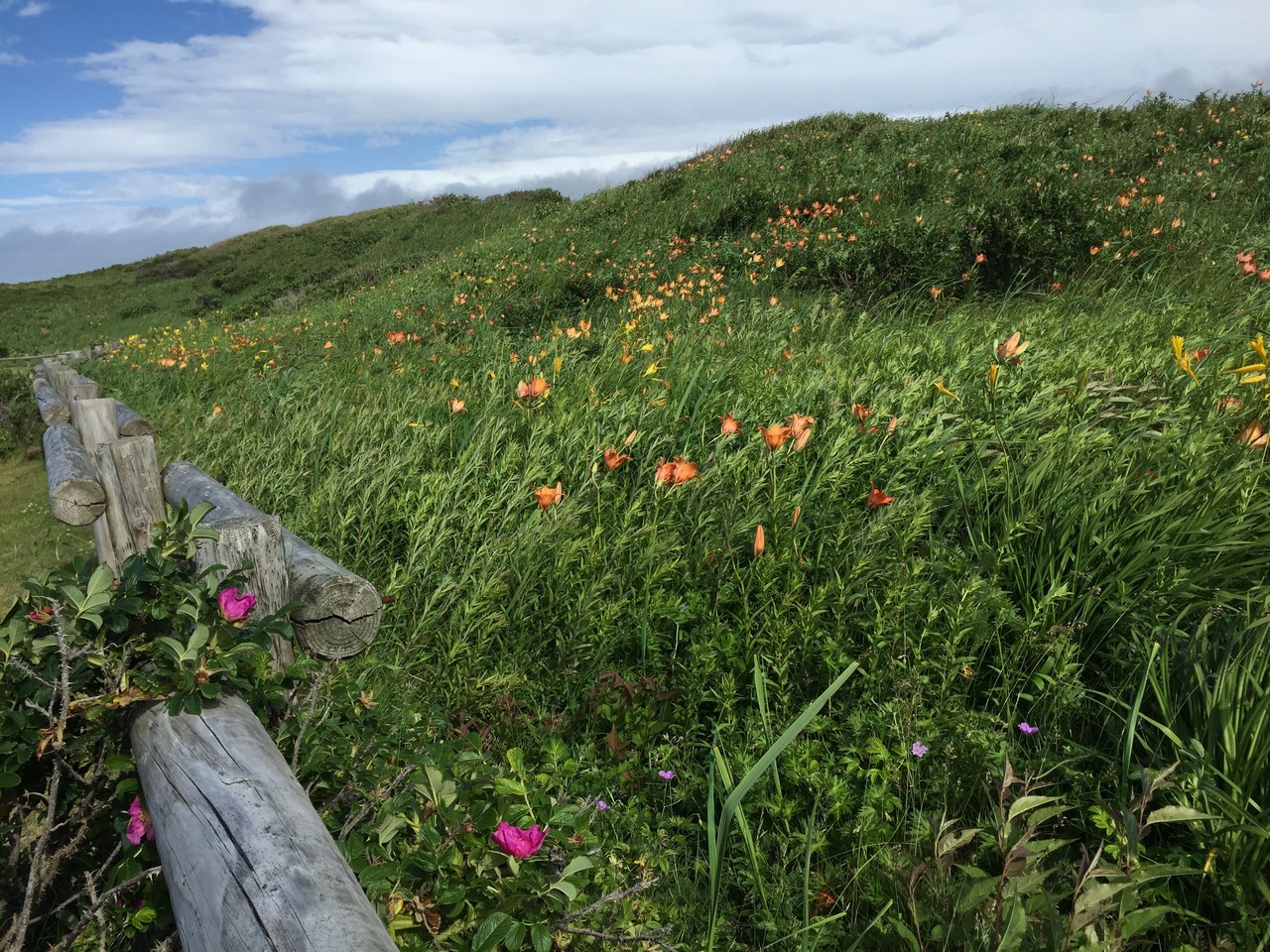 エゾキスゲの黄色と エゾスカシユリのオレンジ ハマナスの濃いピンク これらが咲き誇り 一番華やかな時期に訪れることが出来た。