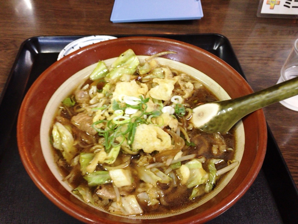 焼きそばが汁に漬かっているというか、ソース味のラーメンといえばいいか、そんな感じのなんともいえないラーメンです。とにかく一度この不思議な味を味わってみてください。