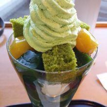 京都タワーが目の前に見えるカウンターに案内されてパフェを食べました。