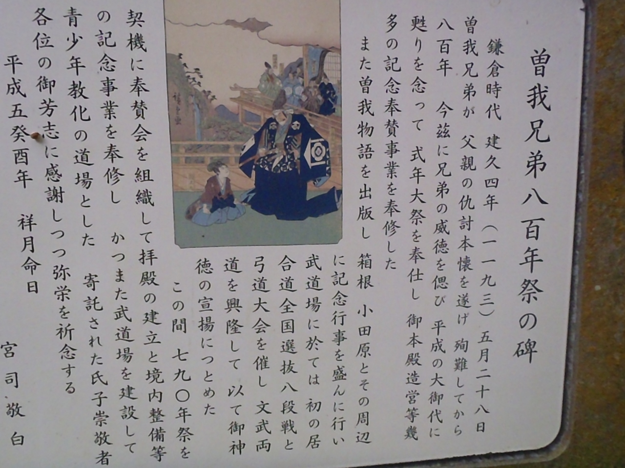 曽我兄弟は、父の仇討の心願成就祈願のため箱根権現に参拝したことなどから境内には兄弟スギなどゆかりのある物があります。