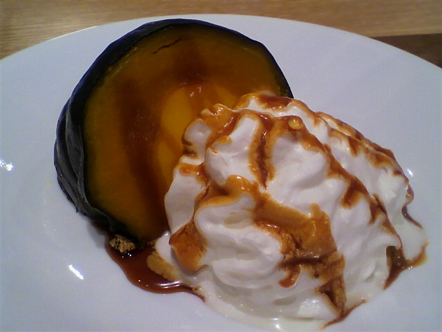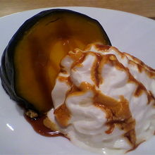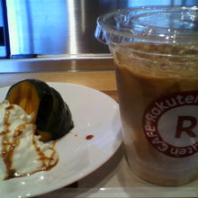 「小玉かぼちゃ焼きプリン」378円(税込)と「アイスカフェラテSサイズ」421円(税込)をイートイン。ドリンク、ケーキ類ともにテイクアウトもできるようです。お会計を済ませると「お席までお持ちします」とのこと。