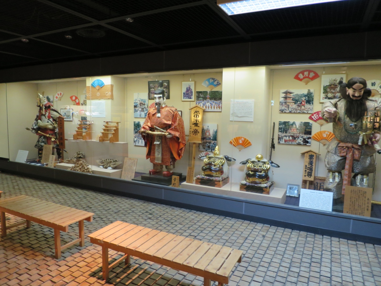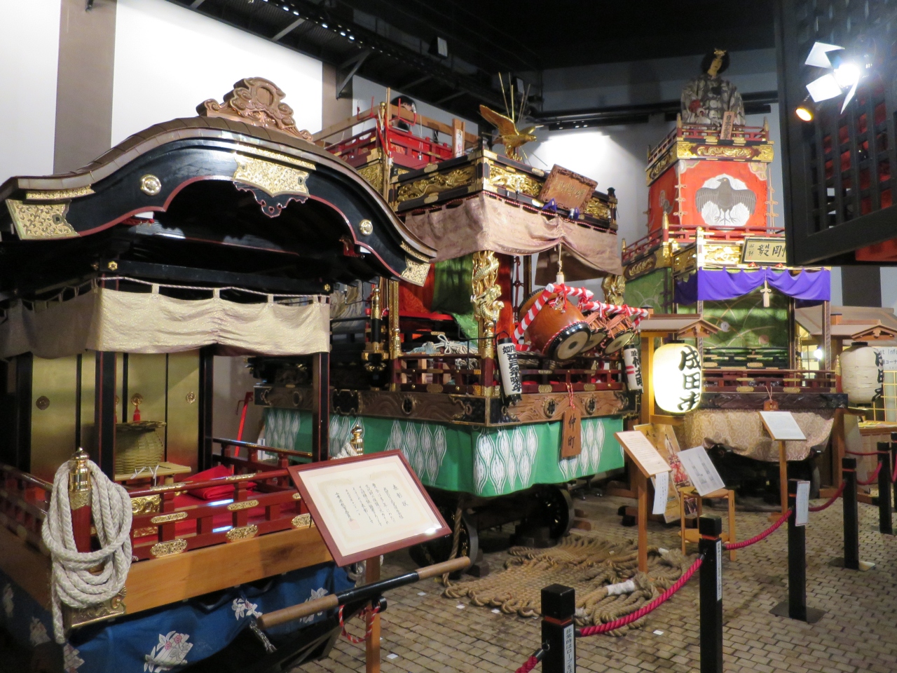 成田駅から成田山新勝寺に向かう参道の途中、丁度うなぎの名店、川豊の正面に成田観光館があります。観光館の前のピロティにはベンチが置かれており、気軽に休憩することができます。観光館の中に入るとただの観光案内所と思いきや、ビデオコーナーやインターネット端末があり、その奥に成田祇園祭の展示場があります。ここには祇園祭の山車が二基展示されており見事です。無料でこのような展示が見られるとは思いませんでした。一見の価値のある観光館です。