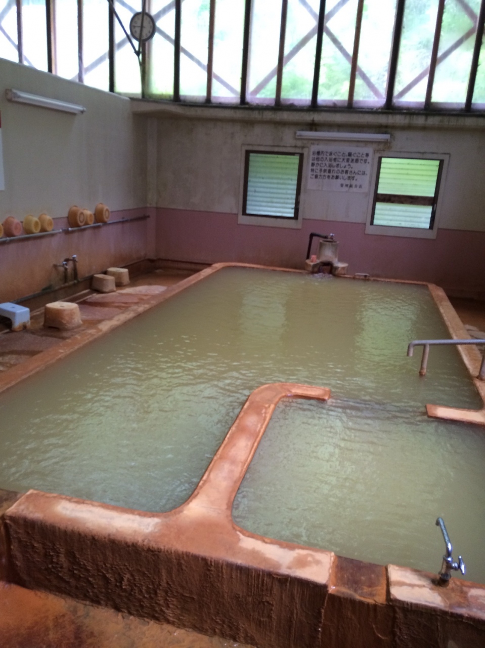 お風呂そのものの雰囲気的には長野県の加賀井温泉一陽館のお風呂のような、鉄のにおいを強く感じる金色のお湯です。足を10センチも入れるとお湯の濁りで見えなくなります。