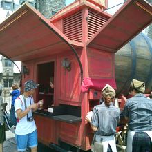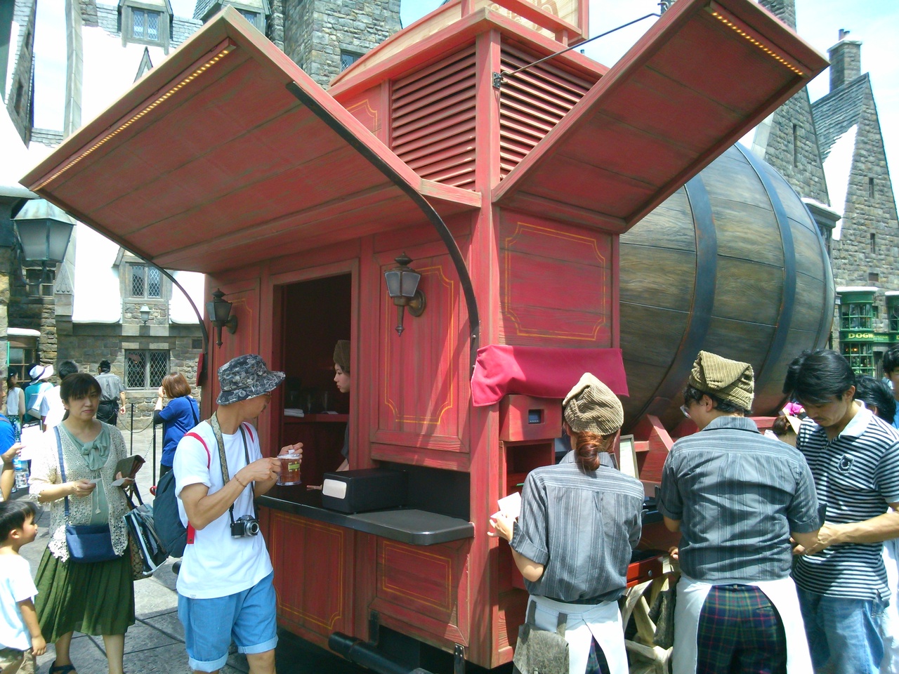 ハリーポッターシリーズ(3作、6作目)に出てくるバタービールを飲めます。バタービール?と聞いて、ビールを想像しますが、蜂蜜たっぷりの甘い飲み物なので、子供も飲めます。ビールの樽の形をしたフードカートがとてもかわいらしいです。
