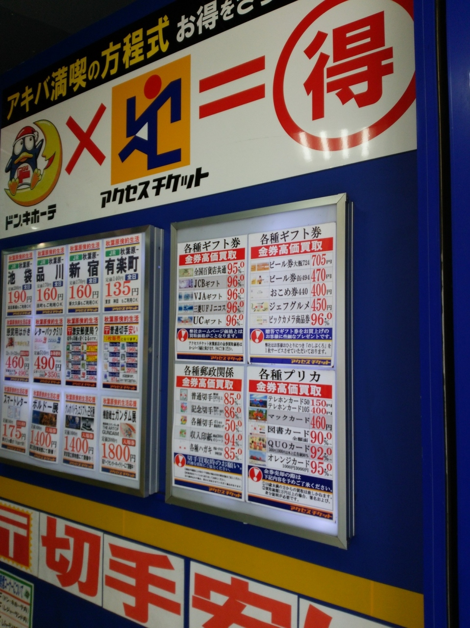 JR秋葉原駅から徒歩数分、中央通り沿いにある激安店「ドンキホーテ」の1階入口付近にありました。お店はとても小さいので、注意していないと見過ごして通り過ぎてしまいます。新幹線や各種施設のチケットが割安な値段で買えます。